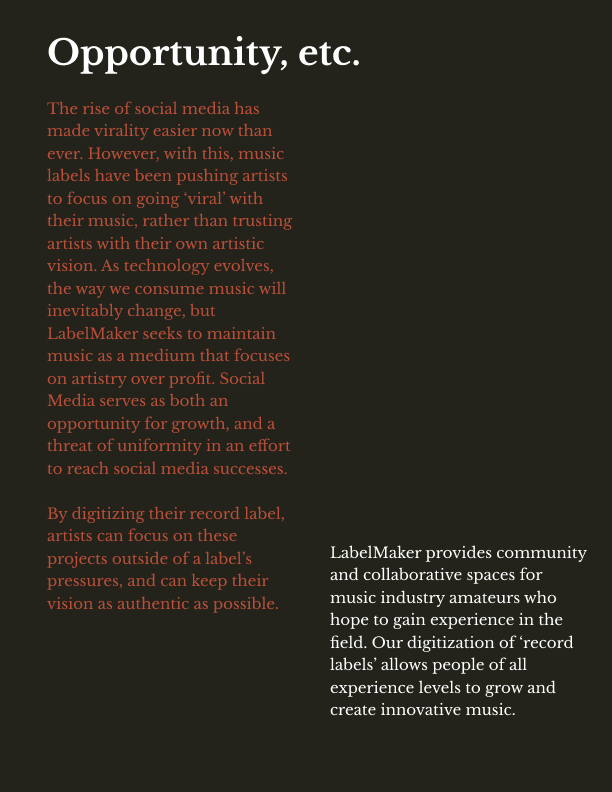 The connections-driven structure of the current music industry breeds an environment where artists and industry workers are often afraid to speak up when they are mistreated by their superiors. I worked alongside three other students to combat this mistreatment by offering an alternate, digital method for connecting artists with collaborators and resources.